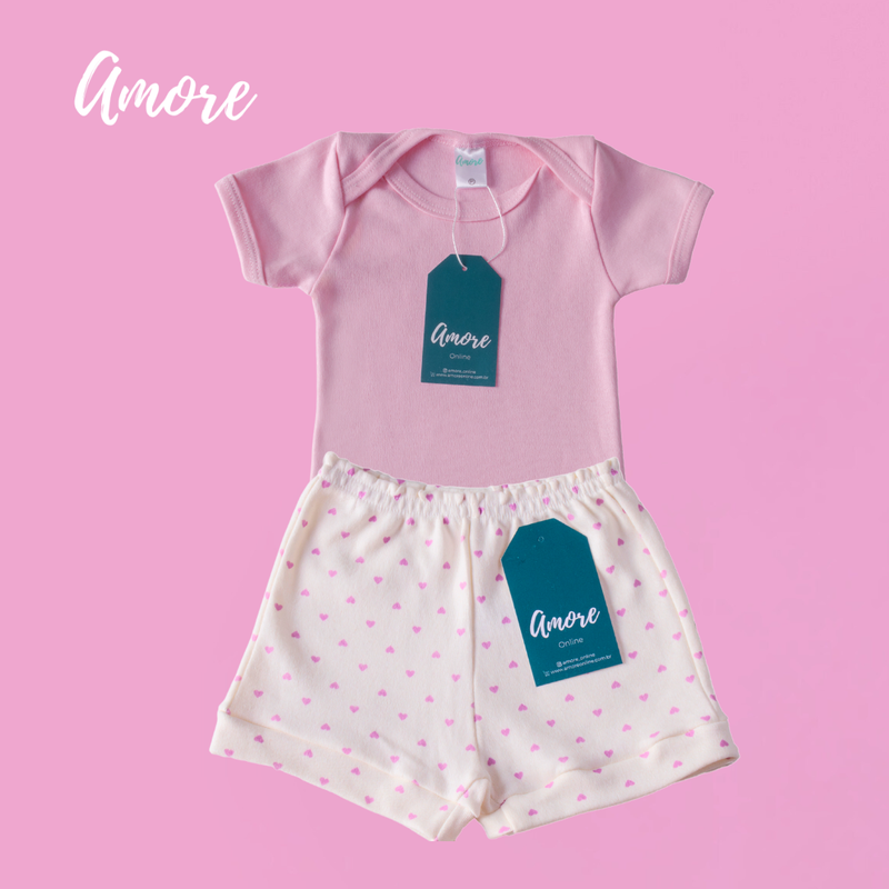 Conjunto Body Manga Curta Amore Rosa e Short Coração